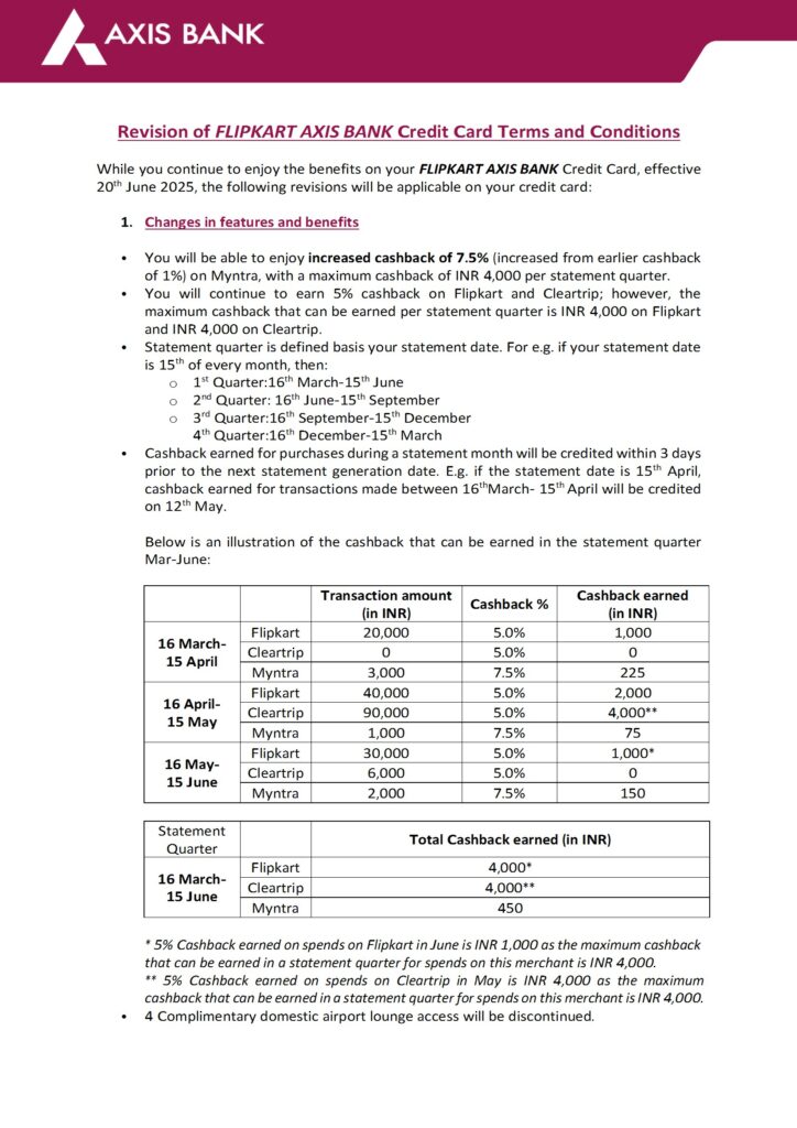 - Flipkart & Cleartrip Cashback Capped: While cardholders will continue to earn 5% cashback on Flipkart and Cleartrip, a new cap is being introduced. The maximum cashback that can be earned per statement quarter is INR 4,000 on Flipkart and INR 4,000 on Cleartrip. This implies that for spends exceeding INR 80,000 on Flipkart or INR 80,000 on Cleartrip within a given quarter, no further 5% cashback will be earned.